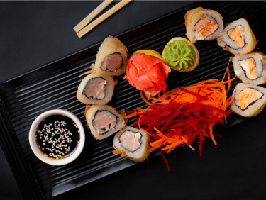 Avocado, lime, salmon, mushrooms and garnish served with pickled ginger and spring onions.